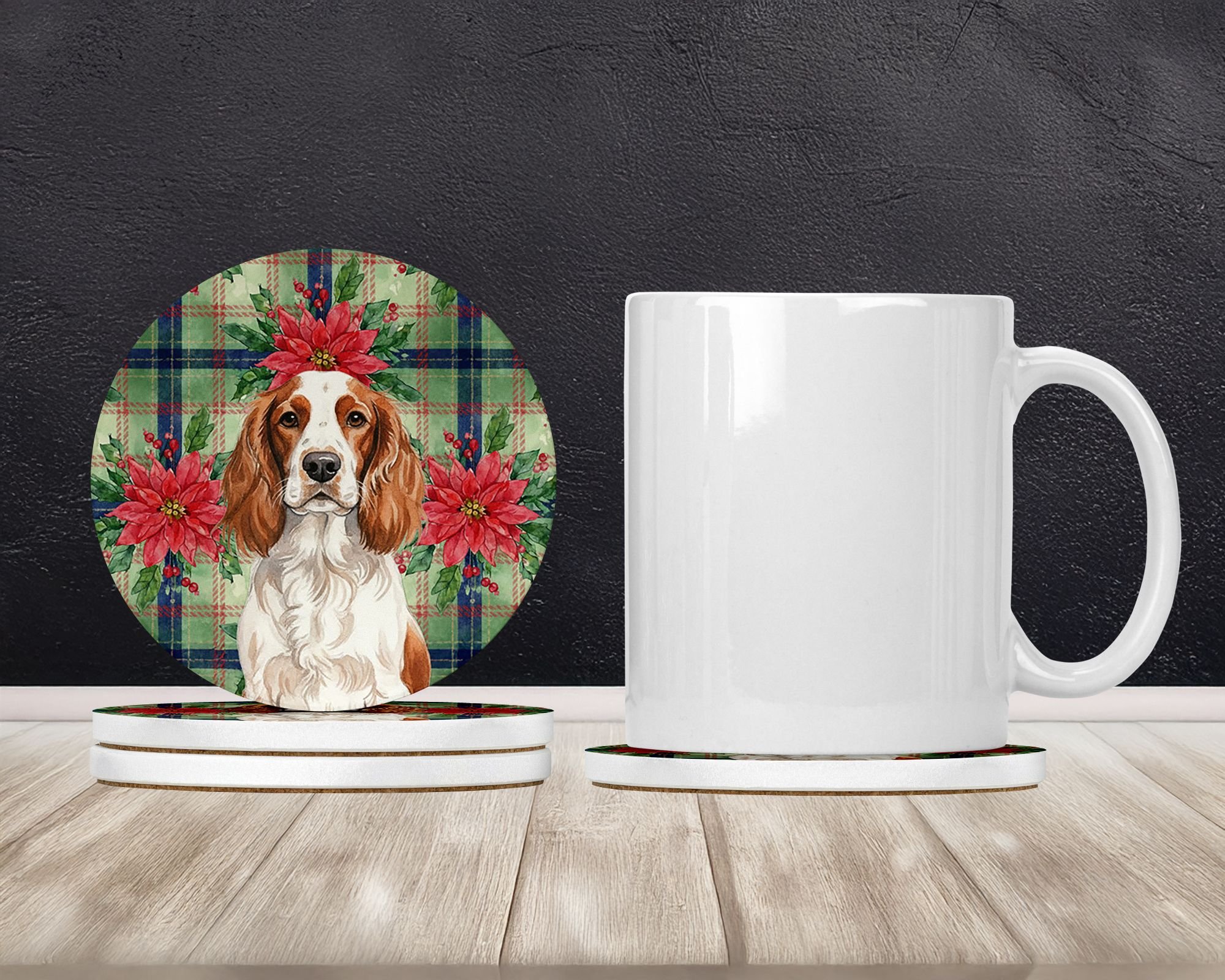 Welsh Springer Spaniel Christmas PoinsettIas Large Sandstone Coasters Pack of 4 Absorbent Round Coasters Decor Gifts for Men or Women, 4 in