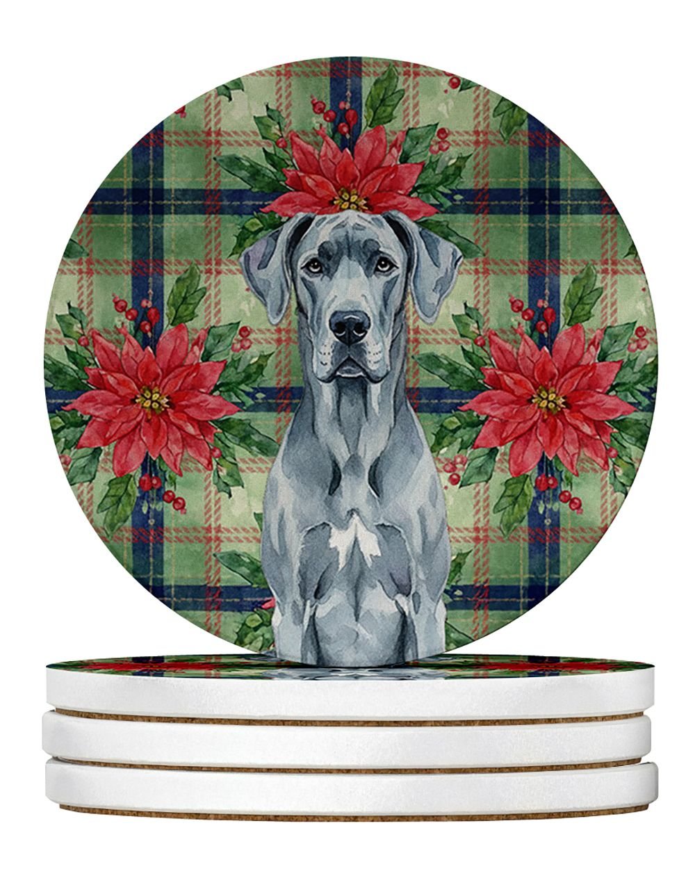 Blue Great Dane Christmas PoinsettIas Large Sandstone Coasters Pack of 4 Absorbent Round Coasters Decor Gifts for Men or Women, 4 in, Multicolor