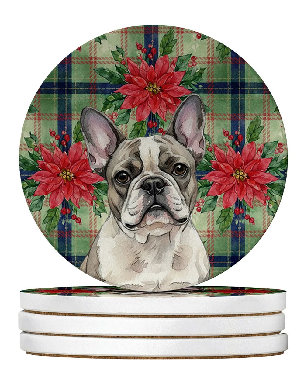 Pied French Bulldog Christmas PoinsettIas Large Sandstone Coasters Pack of 4 Absorbent Round Coasters Decor Gifts for Men or Women, 4 in, Multicolor