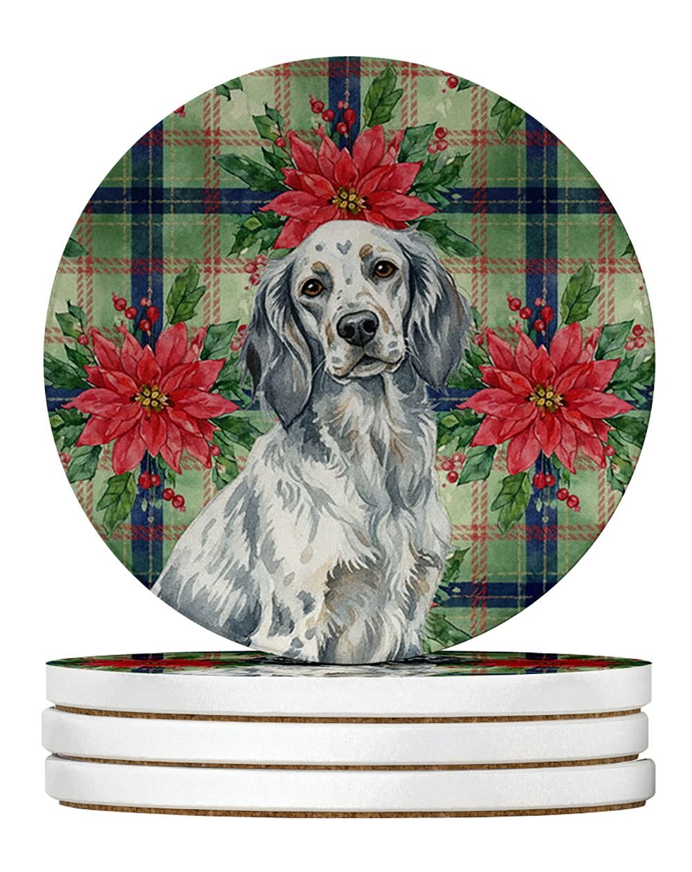 Blue Belton English Setter Christmas PoinsettIas Large Sandstone Coasters Pack of 4 Absorbent Round Coasters Decor Gifts for Men or Women, 4 in