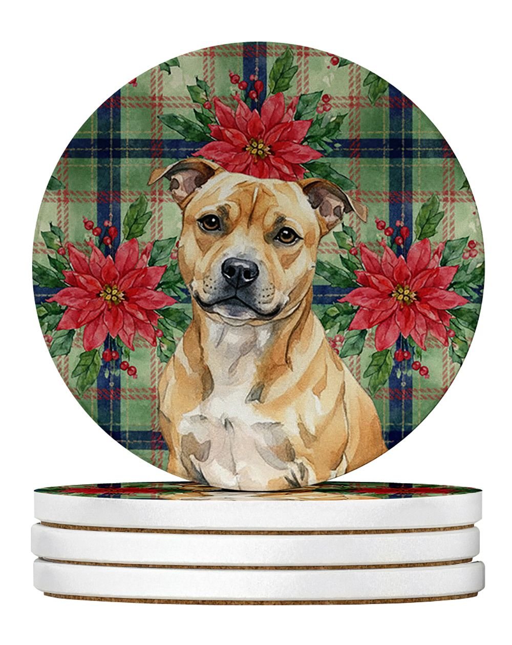 Home > Fawn Staffordshire Bull Terrier Christmas PoinsettIas Large Sandstone Coasters Pack of 4 Absorbent Round Coasters Decor Gifts for Men or Women, 4 in