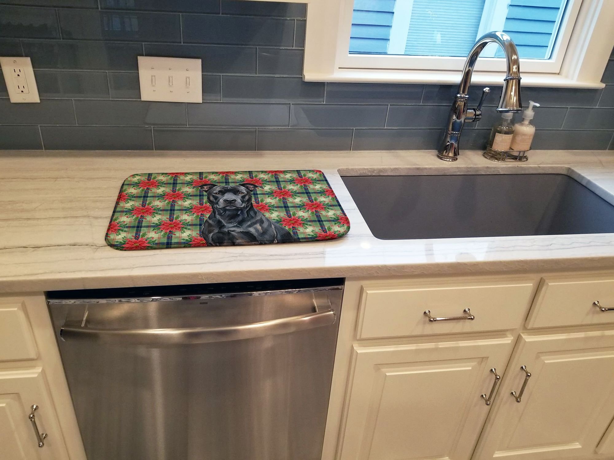 Dish Drying Mat featuring breed specific American Staffordshire Terrier artwork. Celebrate Christmas with this Christmas Dish Drying Mat. Say goodbye to messy countertops and soggy dish towels with our innovative dish drying mat. Our high-quality dish drying pad is designed to keep your countertops dry while offering a stylish and efficient solution. Whether you're air drying dishes, glasses, stemware, silverware, pots, pans, bottles, or even fruits and vegetables, our dish mat is the perfect choice. The 14 inches x 22 inches size fits most counters and dish drying racks, and the non-slip design ensures stability. Made with water-absorbent polyester and a polyurethane foam insert, our dish drying mat is not only functional but also durable. It's machine washable and printed in the USA for long-lasting use. The beautiful artwork adds flair to your kitchen decor, making it a perfect housewarming gift or present for any occasion. Upgrade your kitchen experience with our absorbent and versatile dish drying mat.