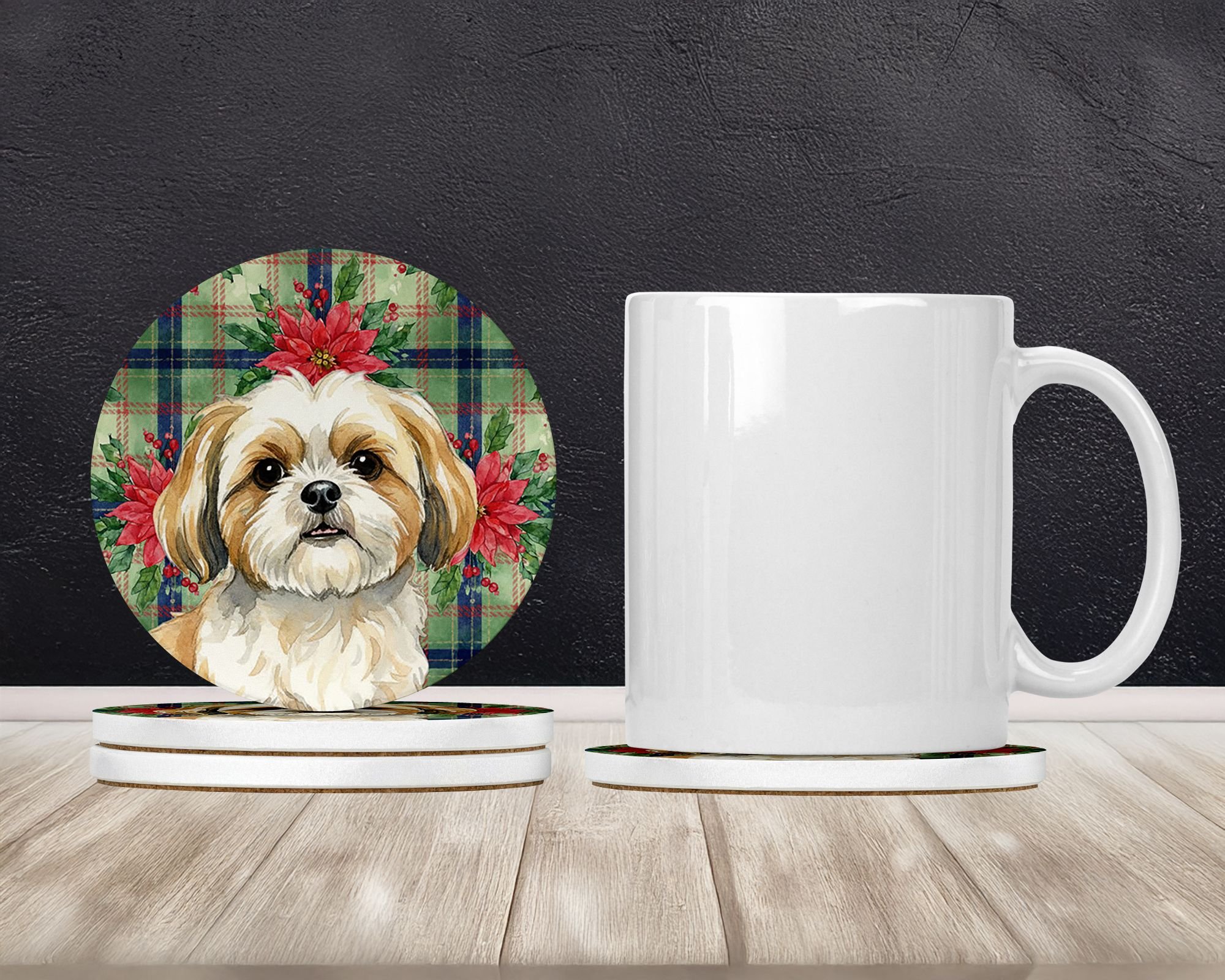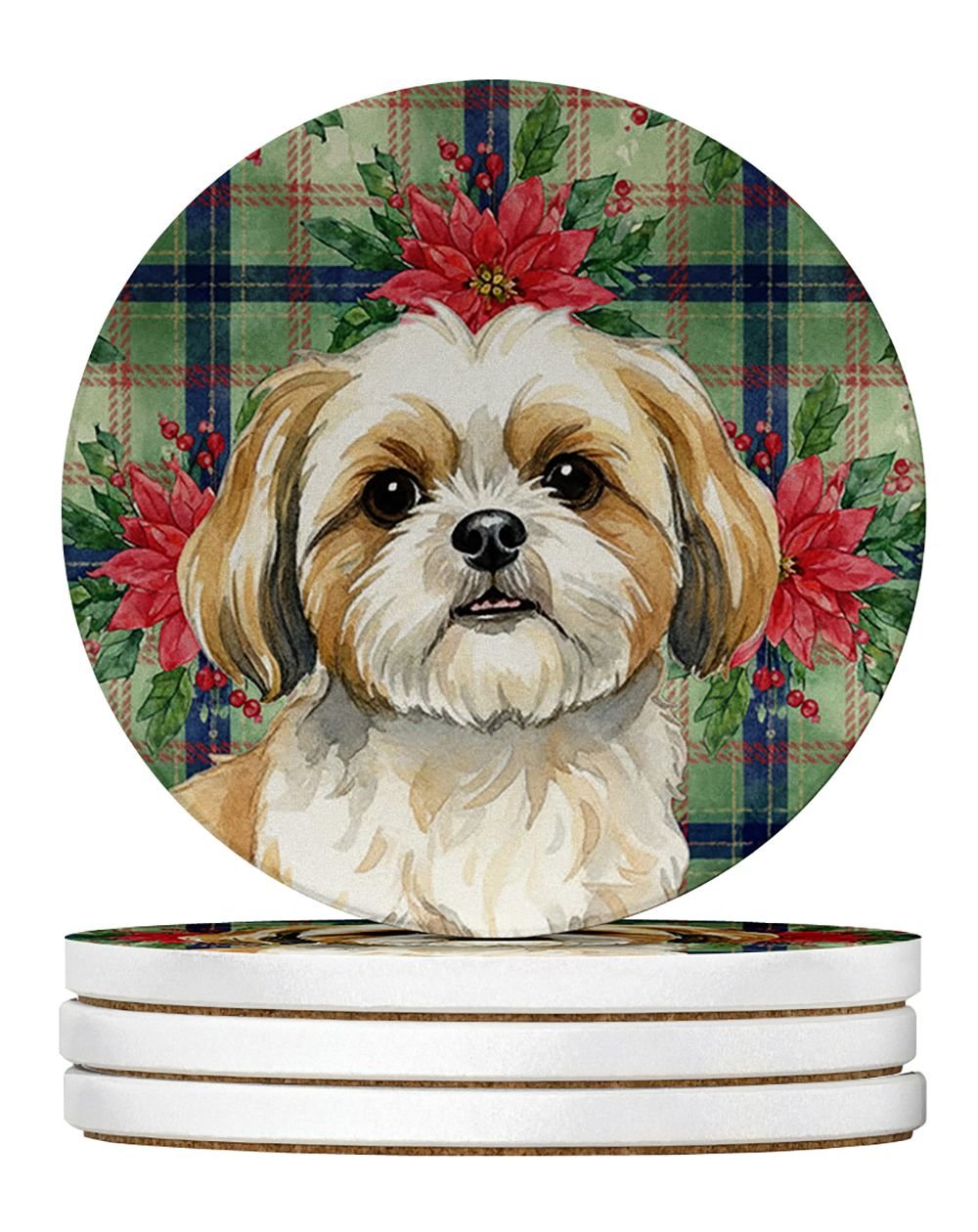 Home > Gold and White Shih Tzu Christmas PoinsettIas Large Sandstone Coasters Pack of 4 Absorbent Round Coasters Decor Gifts for Men or Women, 4 in