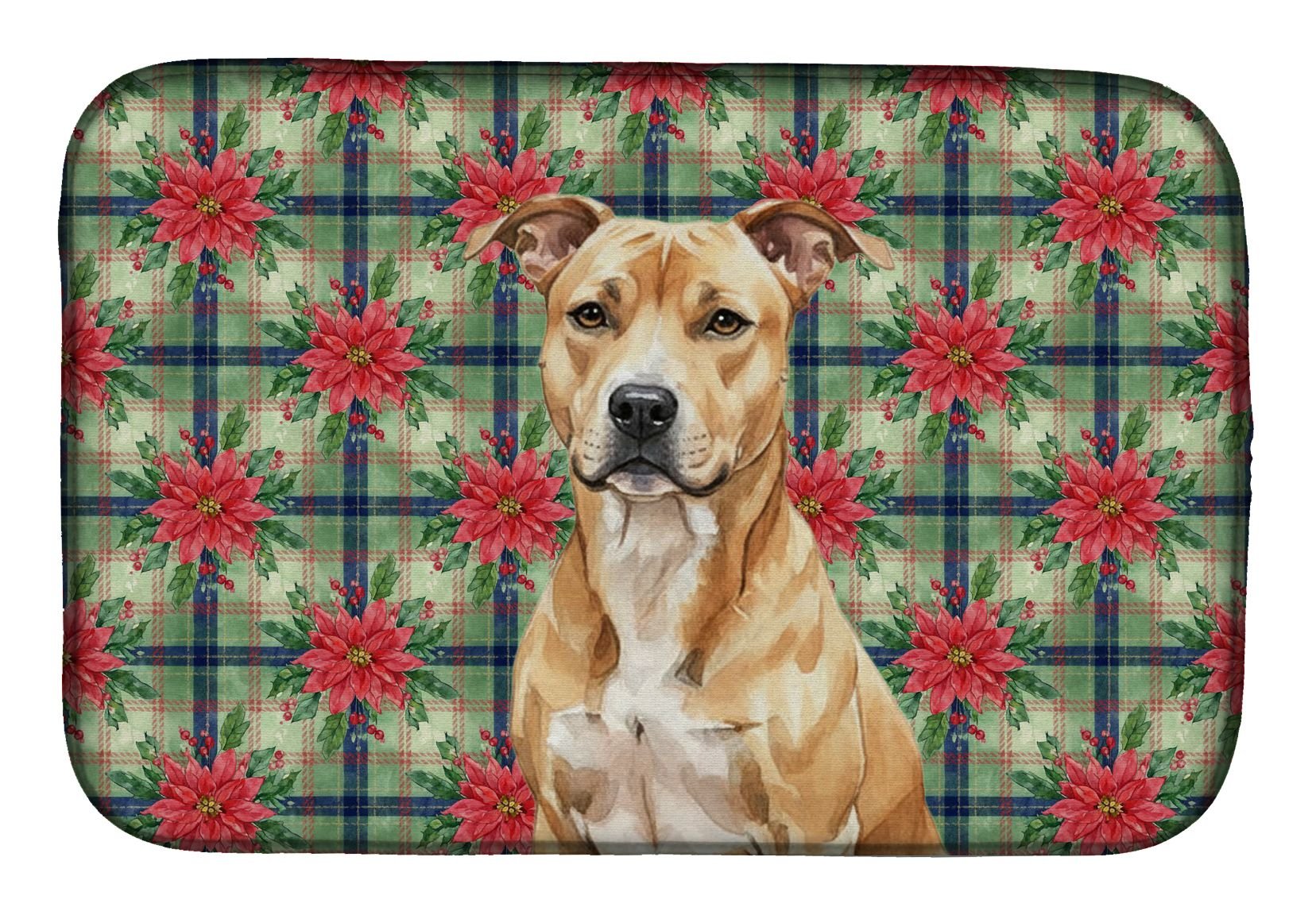 Dish Drying Mat featuring breed specific American Staffordshire Terrier artwork. Celebrate Christmas with this Christmas Dish Drying Mat. Say goodbye to messy countertops and soggy dish towels with our innovative dish drying mat. Our high-quality dish drying pad is designed to keep your countertops dry while offering a stylish and efficient solution. Whether you're air drying dishes, glasses, stemware, silverware, pots, pans, bottles, or even fruits and vegetables, our dish mat is the perfect choice. The 14 inches x 22 inches size fits most counters and dish drying racks, and the non-slip design ensures stability. Made with water-absorbent polyester and a polyurethane foam insert, our dish drying mat is not only functional but also durable. It's machine washable and printed in the USA for long-lasting use. The beautiful artwork adds flair to your kitchen decor, making it a perfect housewarming gift or present for any occasion. Upgrade your kitchen experience with our absorbent and versatile dish drying mat.