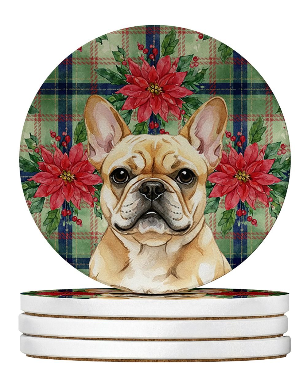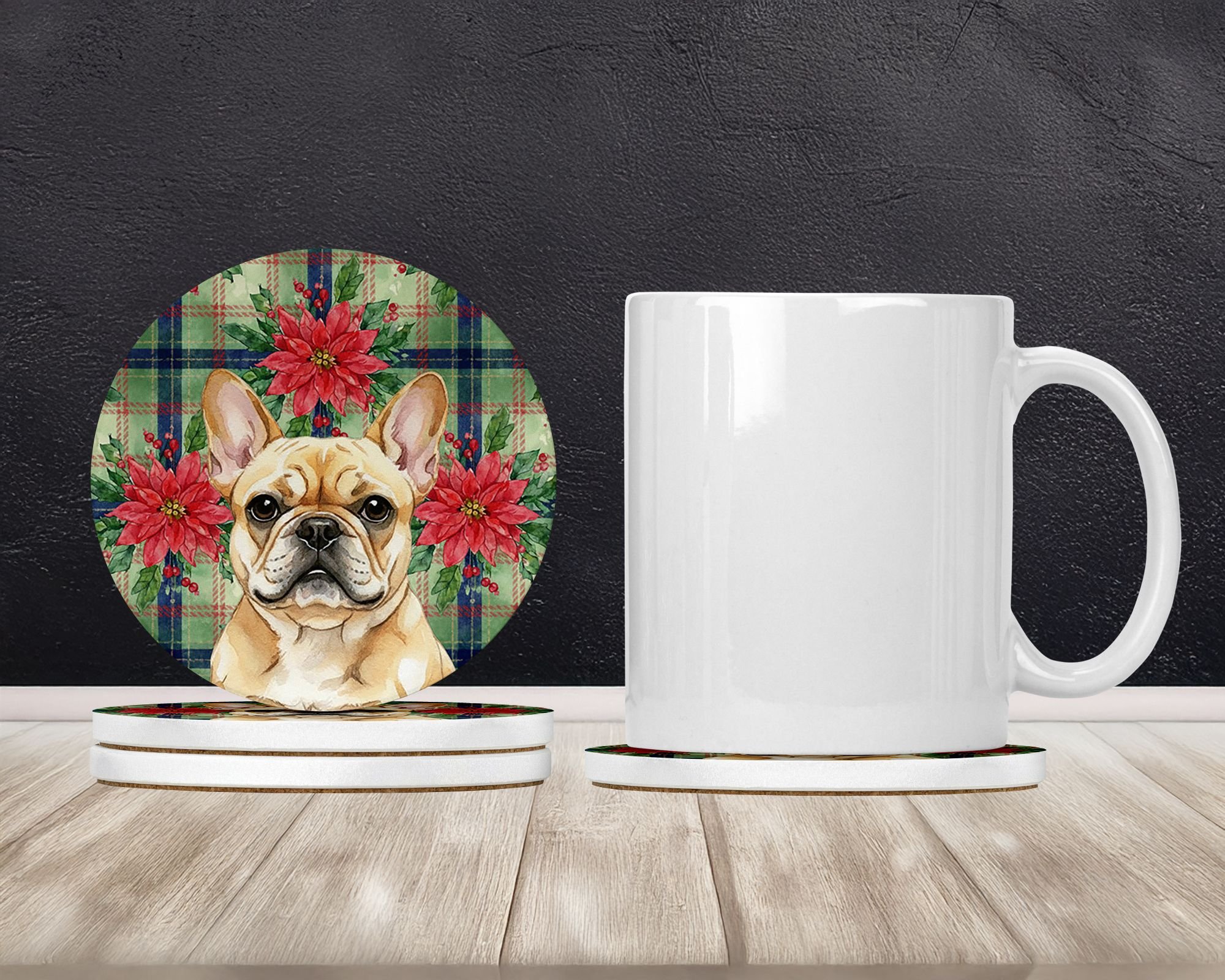 Fawn French Bulldog Christmas PoinsettIas Large Sandstone Coasters Pack of 4 Absorbent Round Coasters Decor Gifts for Men or Women, 4 in, Multicolor
