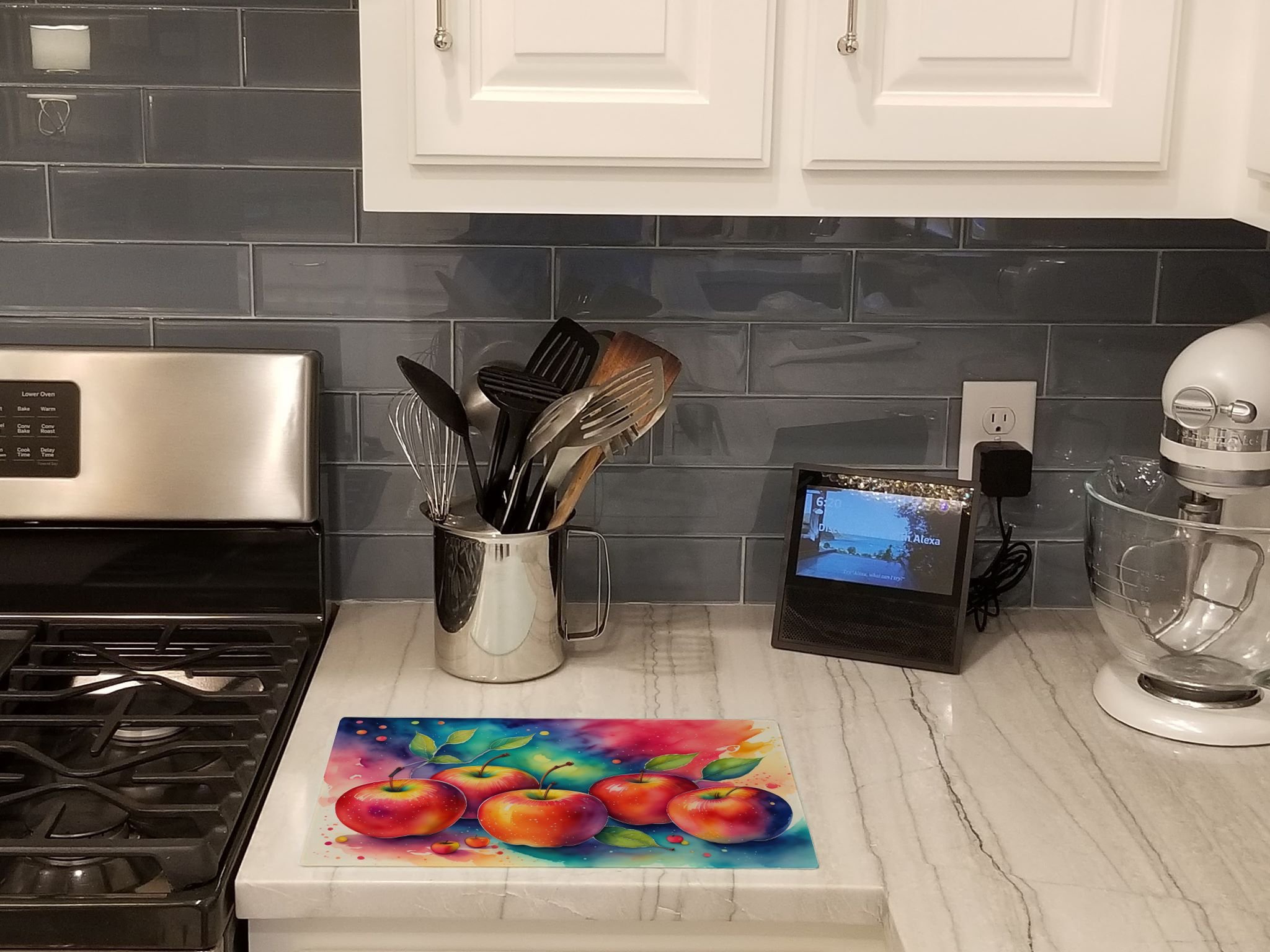 Glass Cutting Board featuring breed specific Apples artwork. Introduce your kitchen to the vibrant, large Decorative Glass Cutting Board from Caroline's Treasures. Crafted from resilient tempered glass, this board is not only a utilitarian necessity but also a colorful art piece. With its generous dimensions of 15 inches in height and 12 inches in length, it offers ample space for all your cutting needs. Every piece showcases captivating artwork from distinguished artists, bringing an aesthetic edge to your kitchen. Beyond its attractive design, this cutting board ensures your countertop stays pristine and unscathed, owing to its heat-resistant properties. Engineered with user convenience in mind, it features non-skid feet for stability, and rounded corners for additional safety. Its robust construction renders it virtually unbreakable, guaranteeing longevity. The board comes with protective feet bumpers, maintaining its position during use. This product is recommended to be hand washed only. Proudly printed and assembled in the United States, this cutting board exemplifies superior craftsmanship. With Caroline's Treasures' Decorative Glass Cutting Board, you're investing in a blend of functionality and artistic flair.