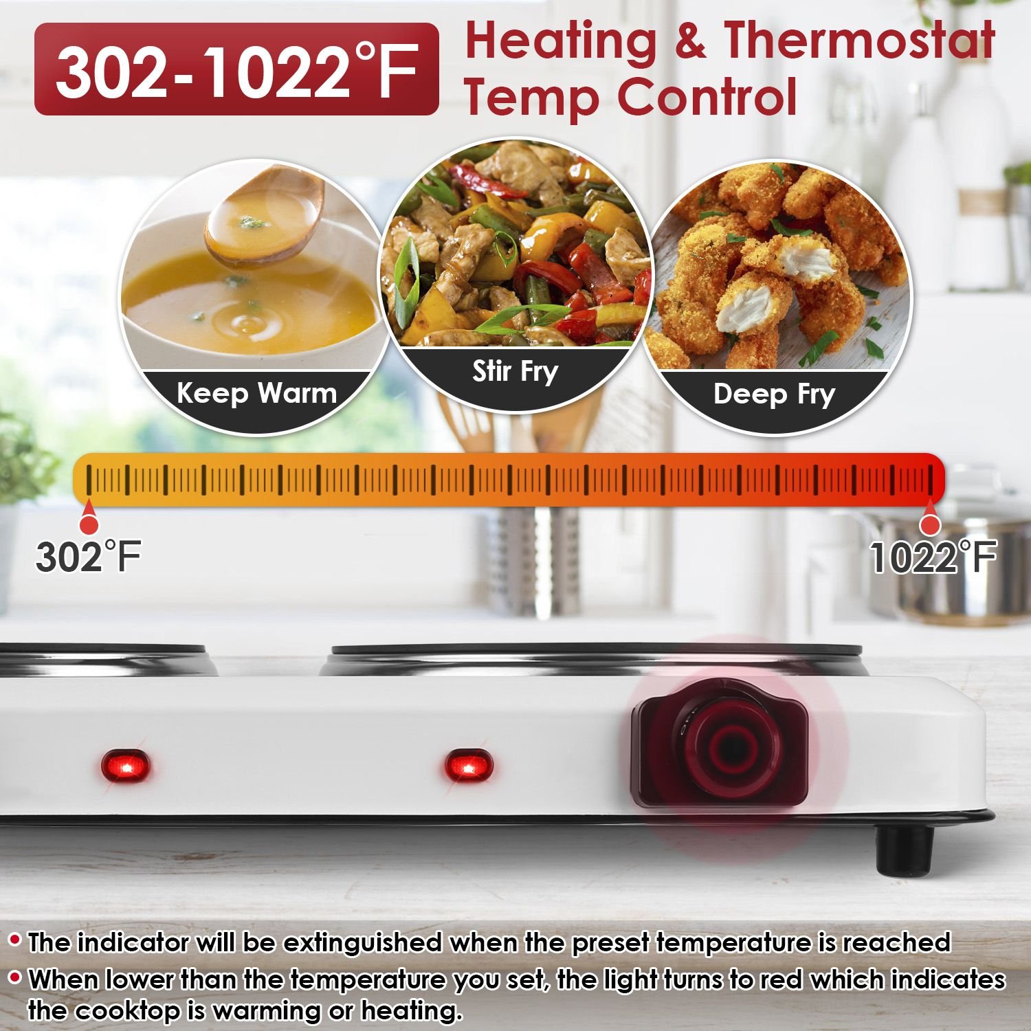 Stepless Heating Temperature: With stepless heating temperature adjustment from 302℉ to 1022℉, easily meet your daily cooking needs, such as boiling water, reheating sauces, making soups, frying steak, cooking pasta, grilling cheese and vegetables, etc.. Knob control and indicator light allows for convenient operation.